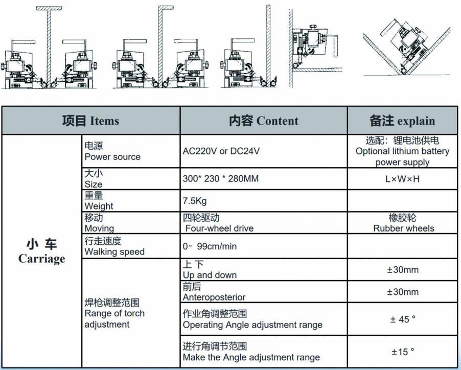 1. This welding car is a multi -function welding machine that should be welded in the plane corner, vertical angle welding, flat docking standing docking and supers truc- ture.